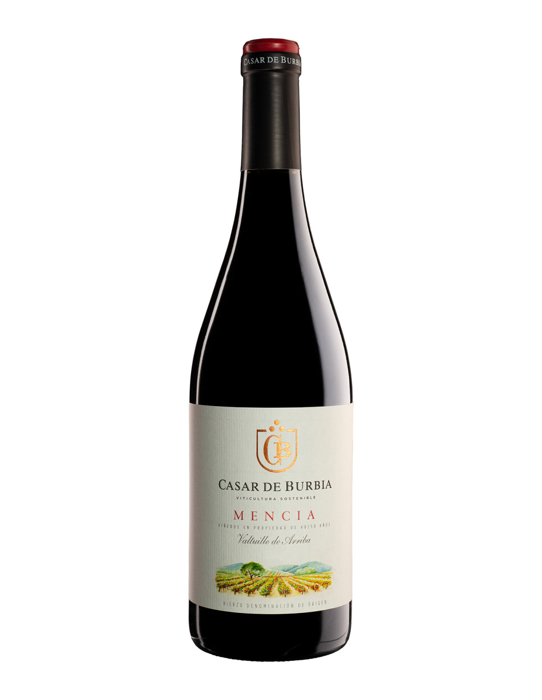 Vino tinto Mencía, DO Bierzo, Casar de Burbia crianza 12 meses en barricas de roble francés. Aterciopelado, goloso y con una gran expresión frutal y floral, fresas, frambuesas y pétalos de rosas. Es el vino de mayor expresión varietal de la Mencía.