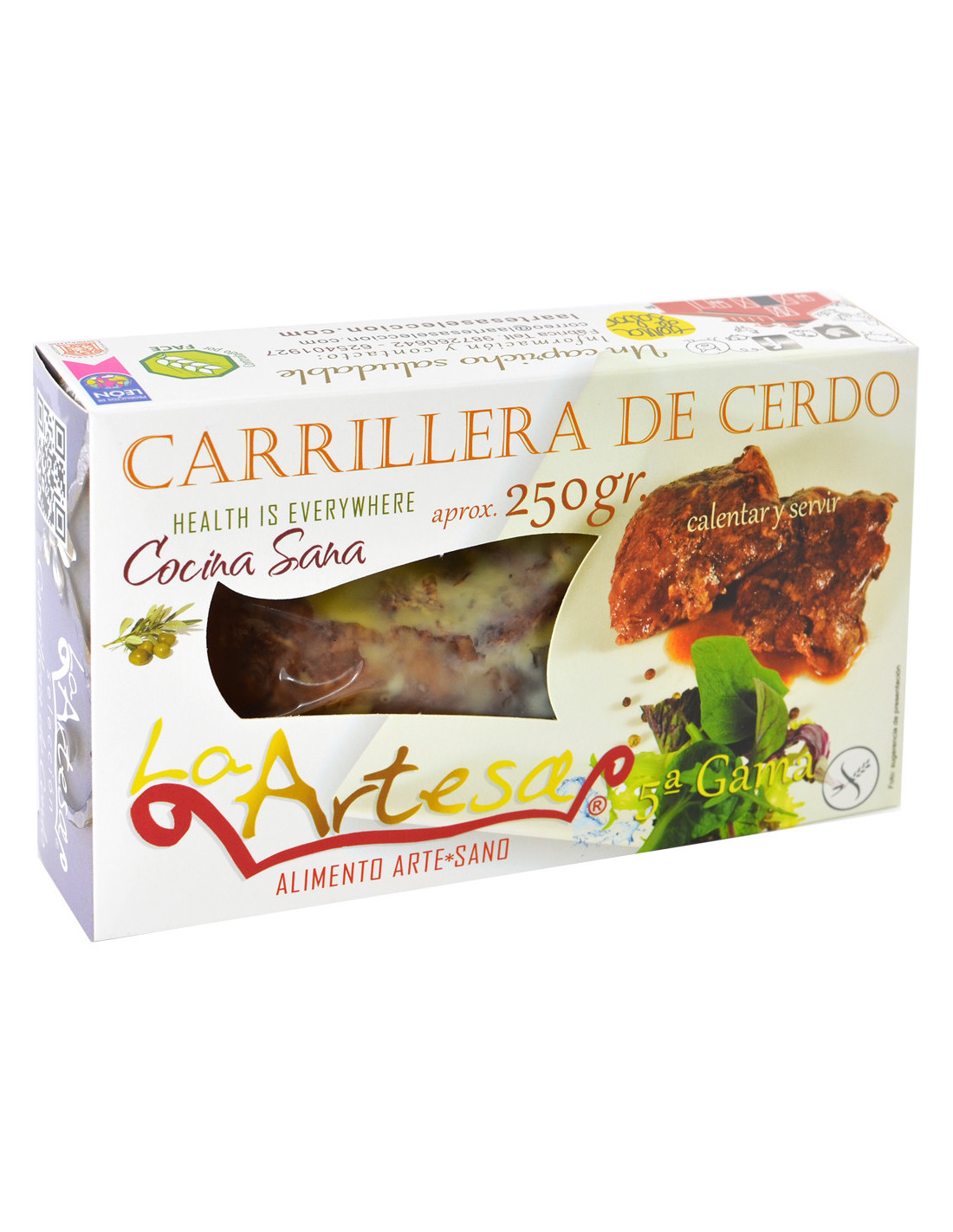Carrillera De Cerdo Ibérico En Su Propio Jugo. Exquisita elaboración de la carrillera de cerdo ibérico es su jugo. Respetando todas las texturas de la carrillera, aplicando toda la innovación disponemos de este jugoso plato precocinado refrigerado. SIN GLUTEN.