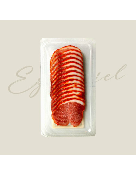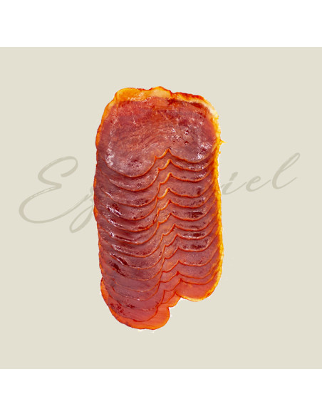 Ingredientes: Cinta de lomo de cerdo, sal, pimentón agridulce y ajo. Ahumado con leña de roble. Conservar en frío. Abrir 10 minutos antes de consumir. Peso: 0,100kg.
