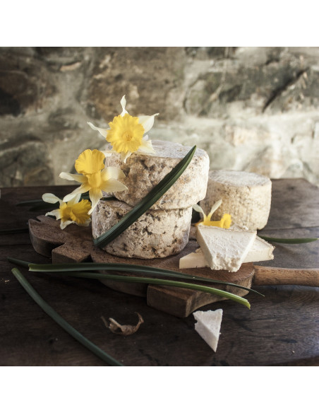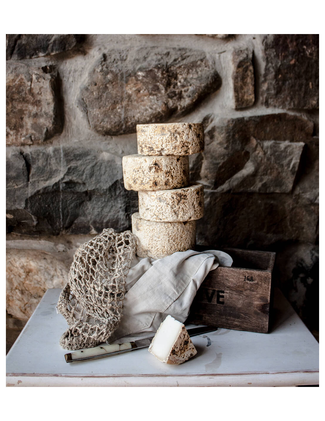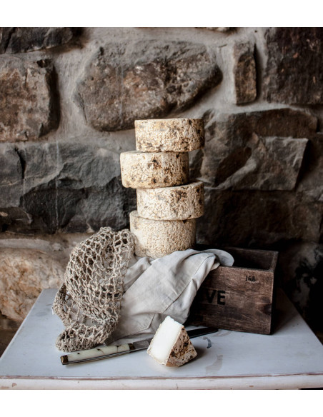 Queso semicurado de leche cruda de cabra. Ingredientes: leche cruda de cabra, fermentos, cuajo y sal. Producto kilómetro cero. Elaborado con leche de ganadería familiar local. Madurado en cámara semienterrada con paredes de piedra natural durante 1,5 meses. Corteza natural comestible, con una fina capa de moho superficial que le aportan un retrogusto maduro y peculiar. Textura firme, semiblanda y cremosa que se deshace en la boca, sabor intenso con matices lácticos. Peso aproximado 500gr. Conservar entre 6ºC y 8ºC. Se aconseja atemperar fuera del envoltorio media hora antes de su consumo.